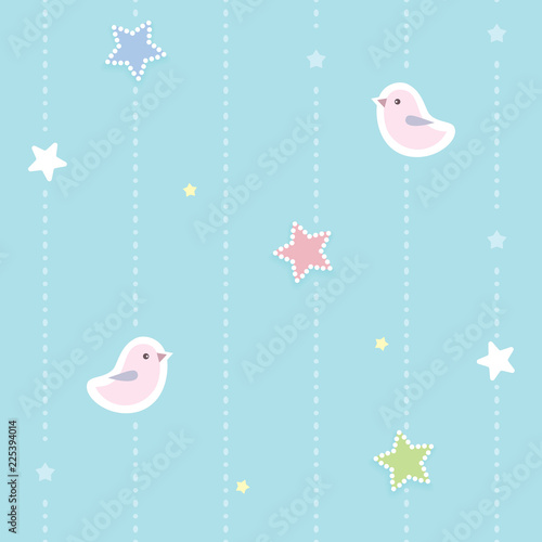 Cute Seamless Background With Colorful Dotted Stars And Pink Birds
